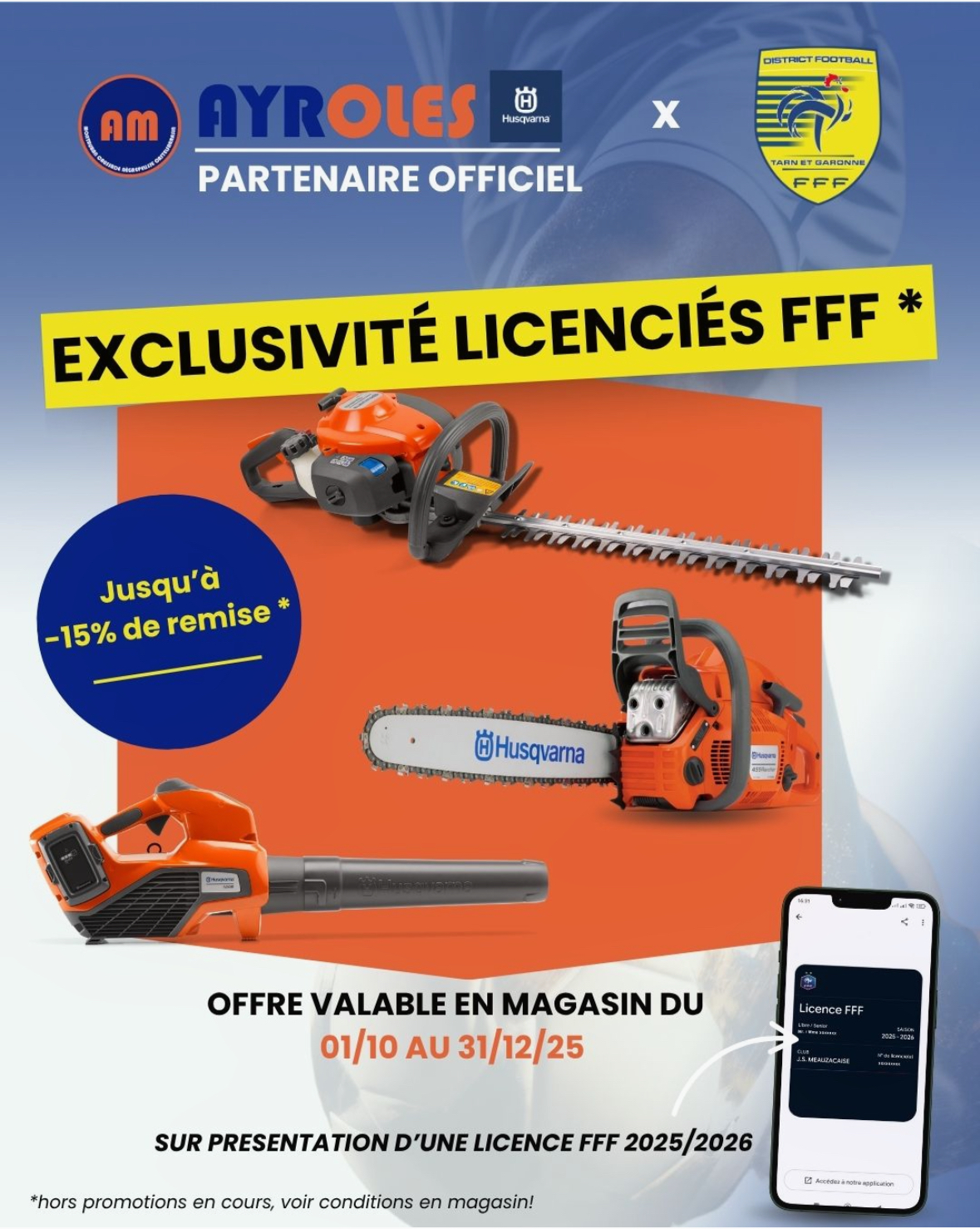 Le District est heureux d’annoncer la signature d’une convention de partenariat avec l’entreprise Ayroles Husqvarna, désormais partenaire officiel du championnat Départementale 1 jusqu’en 2028. Un grand merci à Ayroles Motoculture...